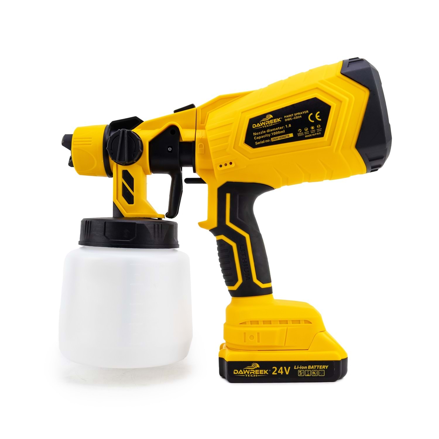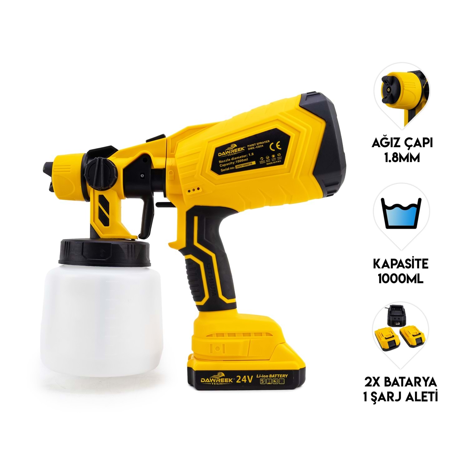 Boya Tabancası DW1000 BT0113 Öne Çıkan Özellikler: 3 Hız Ayarı: Farklı projeler için uygun hız seçenekleri. Hızlı Şarj: Kısa sürede tam şarj imkanı. Yüksek Kapasiteli Batarya: Uzun süreli kullanım için ideal. Bakır Motor: Dayanıklı ve güçlü performans. Ağız Çapı 1.8mm Kapasitesi 1000ml Ürün Detayları: Dawreek Kablosuz Boya Tabancası, ev ve bahçe projelerinizde profesyonel sonuçlar elde etmenizi sağlar. Ergonomik tasarımı ve hafif yapısı ile kullanım kolaylığı sunar. Ürün, iki adet yüksek kapasiteli batarya ve hızlı şarj cihazı ile birlikte gelir. 3 farklı hız ayarı sayesinde, farklı yüzeylerde ve projelerde en iyi sonucu almanızı sağlar. Bakır motoru ile uzun ömürlü ve güçlü bir performans sunar.
