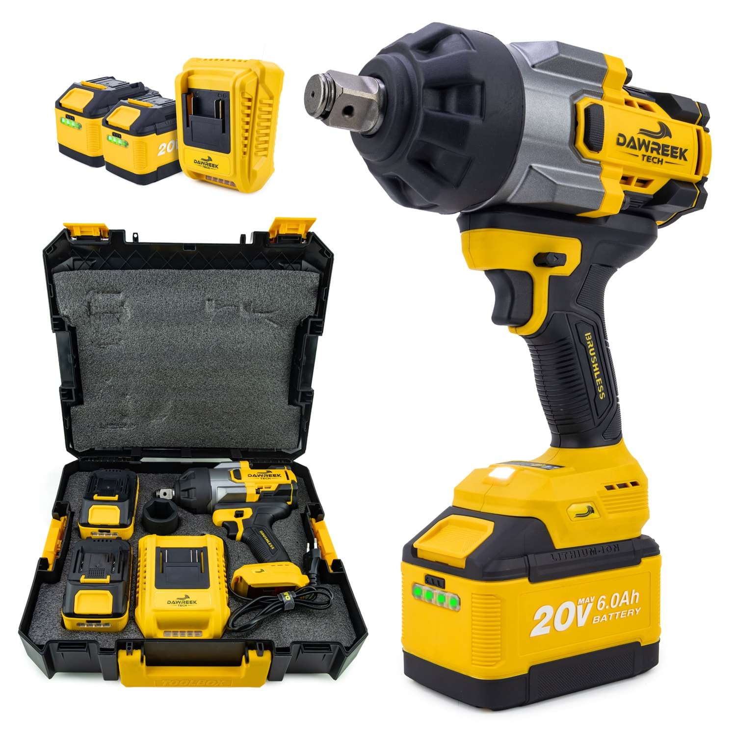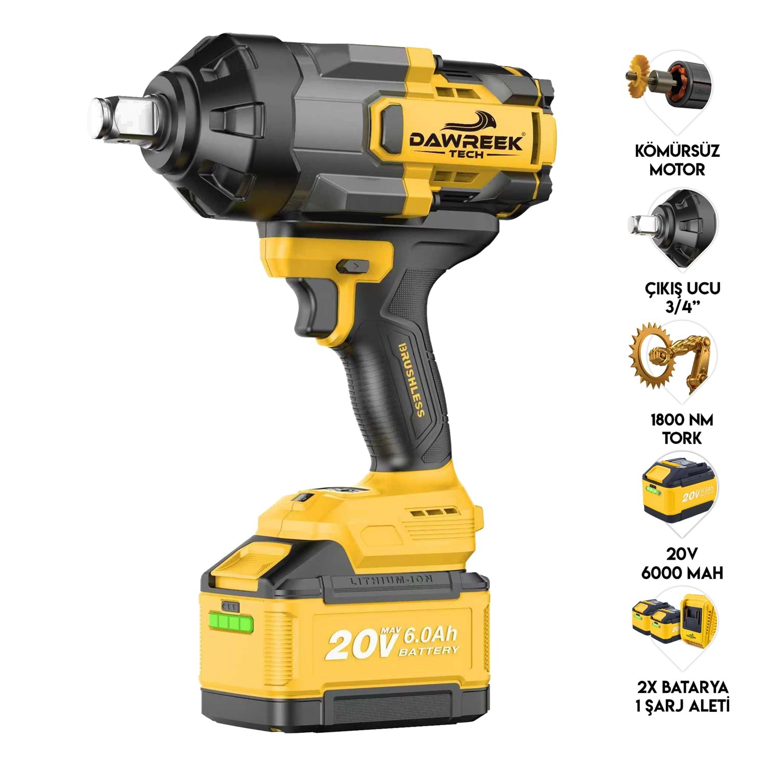 Dawreek TECH DT03W Akülü Somun Sökme, güçlü kömürsüz motoru sayesinde 1800 Nm tork üreterek zorlu somun ve civata işlemlerinde yüksek performans sunar. 3/4” çıkış ucu ve darbe mekanizması ile profesyonel kullanıma uygundur. 20V 6000 mAh kapasiteli 2 adet batarya ve şarj aleti ile uzun süre kesintisiz çalışma imkânı sağlar. LED aydınlatma özelliği sayesinde karanlık ve dar alanlarda rahat kullanım sunar. Yüksek hız ve dayanıklı yapısıyla hem profesyonel hem de hobi kullanımları için idealdir.
