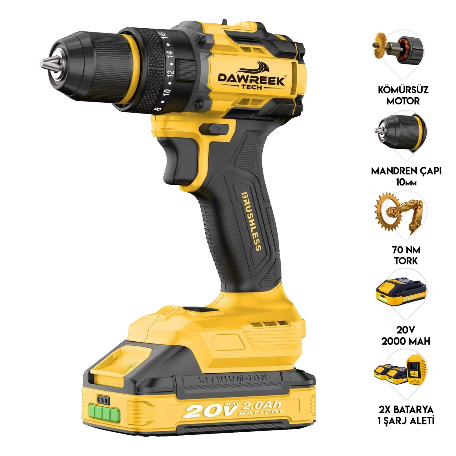 Dawreek TECH Akülü Vidalama DT02D – Profesyonel Güç, Kesintisiz Performans Dawreek TECH DT02D akülü vidalama, profesyonel kullanıcılar için yüksek performans ve dayanıklılık sunacak şekilde tasarlanmıştır. Kömürsüz motor teknolojisi, daha uzun motor ömrü, daha düşük ısınma ve maksimum verimlilik sağlar. 70 Nm yüksek tork gücü, sert yüzeylerde ve ağır işlerde üstün vidalama ve delme performansı sunar. 20V 2000 mAh batarya, uzun süreli kullanım imkânı verirken, 2 adet batarya ve şarj aleti sayesinde işiniz kesintiye uğramaz. 10 mm çelik mandren, uç değişimini hızlı ve güvenli hale getirir. 20+1 kademeli tork ayarı, farklı malzeme ve uygulamalara göre hassas kontrol sağlar. 2 kademeli hız vitesi ile hem yüksek tork gerektiren işlerde hem de hızlı vidalama işlemlerinde optimum performans elde edebilirsiniz. 1900 dev/dk yüksüz hız, hızlı ve verimli çalışma sunar. Ergonomik tasarımı ve güçlü teknik özellikleriyle Dawreek TECH DT02D, profesyonel ustalar ve yoğun kullanım gerektiren işler için ideal bir akülü vidalama çözümüdür. Entegre LED aydınlatma, karanlık ve dar alanlarda net görüş sağlar. Makinenin otomatik kendini korumaya alma özelliği, aşırı yüklenme ve ısınmalara karşı motoru koruyarak uzun ömürlü kullanım sunar. Ürün, 6 ay koşulsuz garanti ile desteklenmektedir.