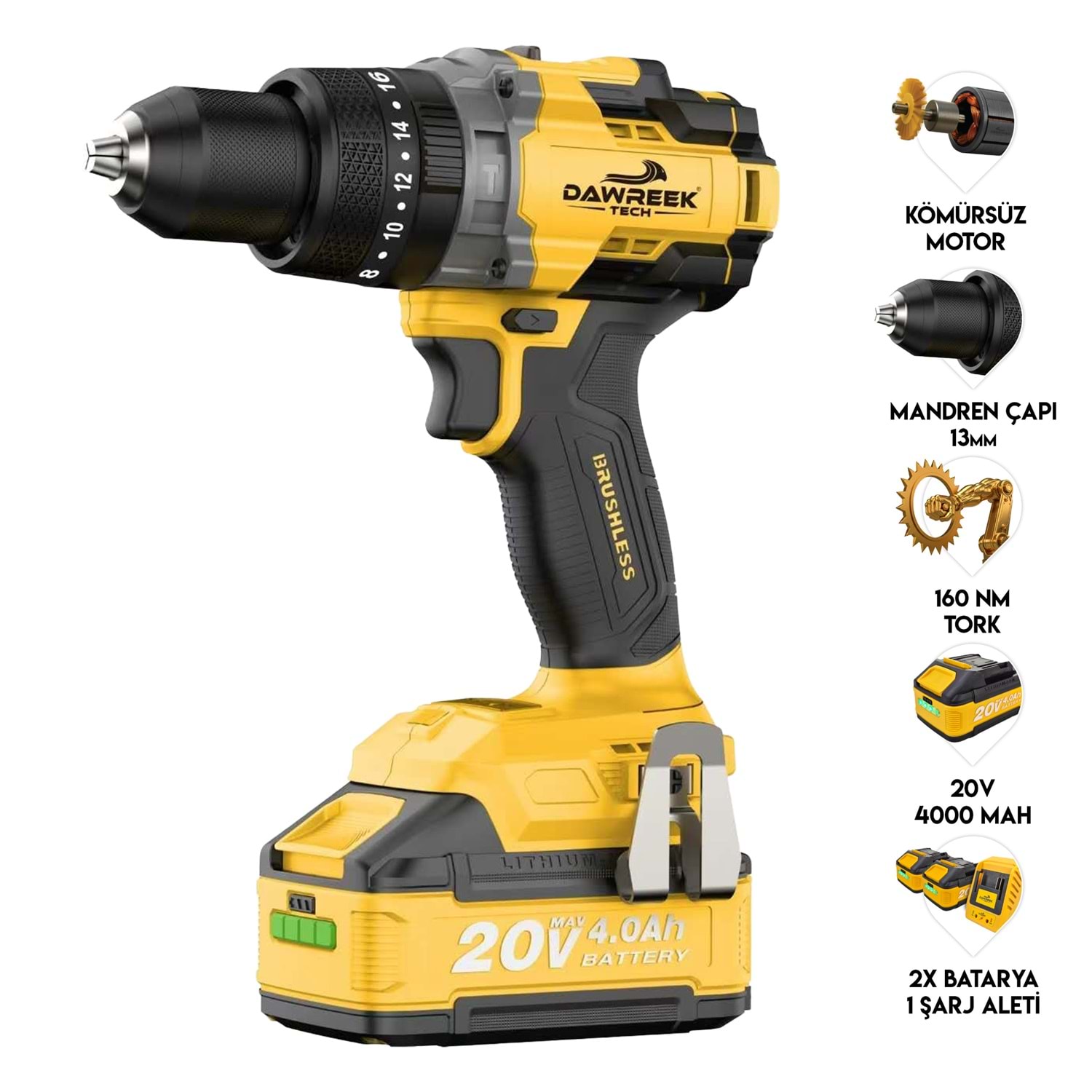 Dawreek TECH Akülü Vidalama DT04D – Profesyonel Güç, Kesintisiz Performans Dawreek TECH DT04D akülü vidalama, profesyonel kullanıcılar için yüksek performans ve dayanıklılık sunacak şekilde tasarlanmıştır. Kömürsüz motor teknolojisi, daha uzun motor ömrü, daha düşük ısınma ve maksimum verimlilik sağlar. 160 Nm yüksek tork gücü, sert yüzeylerde ve ağır işlerde üstün vidalama ve delme performansı sunar. 20V 4000 mAh batarya, uzun süreli kullanım imkânı verirken, 2 adet batarya ve şarj aleti sayesinde işiniz kesintiye uğramaz. 13 mm çelik mandren, uç değişimini hızlı ve güvenli hale getirir. 20+1+1 kademeli tork ayarı, farklı malzeme ve uygulamalara göre hassas kontrol sağlar. 2 kademeli hız vitesi ile hem yüksek tork gerektiren işlerde hem de hızlı vidalama işlemlerinde optimum performans elde edebilirsiniz. 2200 dev/dk yüksüz hız, hızlı ve verimli çalışma sunar.Darbeli 33.000 İPM Ergonomik tasarımı ve güçlü teknik özellikleriyle Dawreek TECH DT04D, profesyonel ustalar ve yoğun kullanım gerektiren işler için ideal bir akülü vidalama çözümüdür. Entegre LED aydınlatma, karanlık ve dar alanlarda net görüş sağlar. Aşırı yüklenme ve ısınmalara karşı motoru koruyarak uzun ömürlü kullanım sunar. Ürün, 6 ay koşulsuz garanti ile desteklenmektedir.