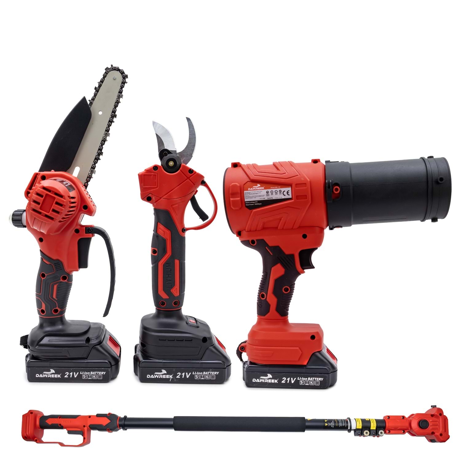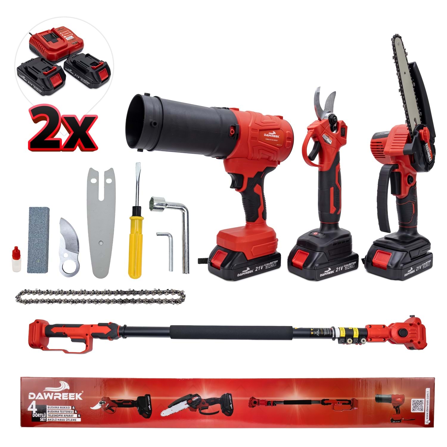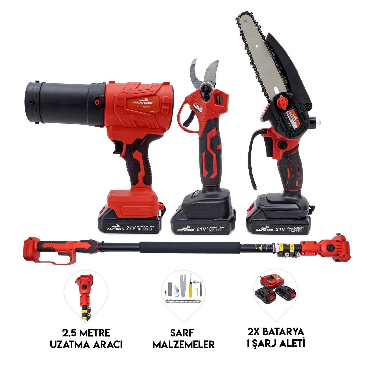 Dawreek BT0241 Dörtlü Budama Seti MW (Teleskopik 2.5m+Ağaç Budama+Bağ Makası+Turbo Fani) Bahçe ve ağaç bakımında tek bir ürünle tüm ihtiyaçlarınızı karşılayın! Dawreek BT0241 dörtlü budama seti, güçlü motor yapısı, çok yönlü kullanım seçenekleri ve 2.5 metre teleskopik uzatma aparatı ile hem amatör hem profesyonel kullanıcılar için ideal bir çözümdür. Ürün İçeriği: Şarjlı mini zincirli testere Şarjlı budama makası Turbo fan (üfleme aparatı) 2.5 metre teleskopik uzatma kolu 2 adet yüksek kapasiteli batarya Şarj cihazı Yedek zincir ve bakım ekipmanları Montaj aparatları ve el aletleri Öne Çıkan Özellikler: 2.5 Metre Uzatma Aparatı: Yüksek dallara merdivensiz, güvenli erişim sağlar. 4 Fonksiyon Tek Set: Kesme, budama ve temizleme işlemlerini tek cihazla yapabilirsiniz. Güçlü Motor Performansı: Sert dallarda bile hızlı ve etkili kesim. Şarjlı ve Taşınabilir: Kablo derdi olmadan özgür kullanım. Ergonomik Tasarım: Uzun süreli kullanımlarda bile konfor sağlar. Çift Batarya Avantajı: Kesintisiz çalışma süresi.