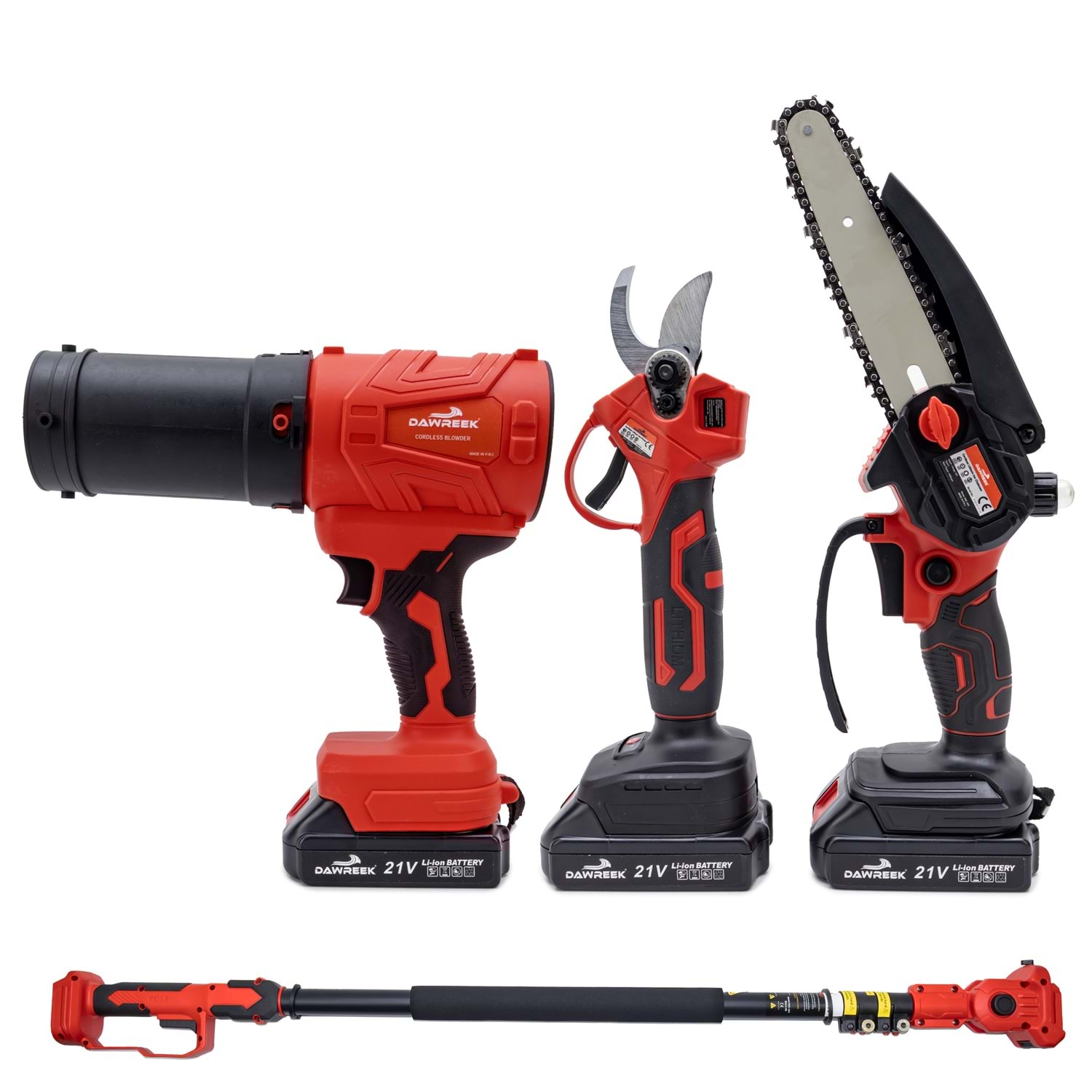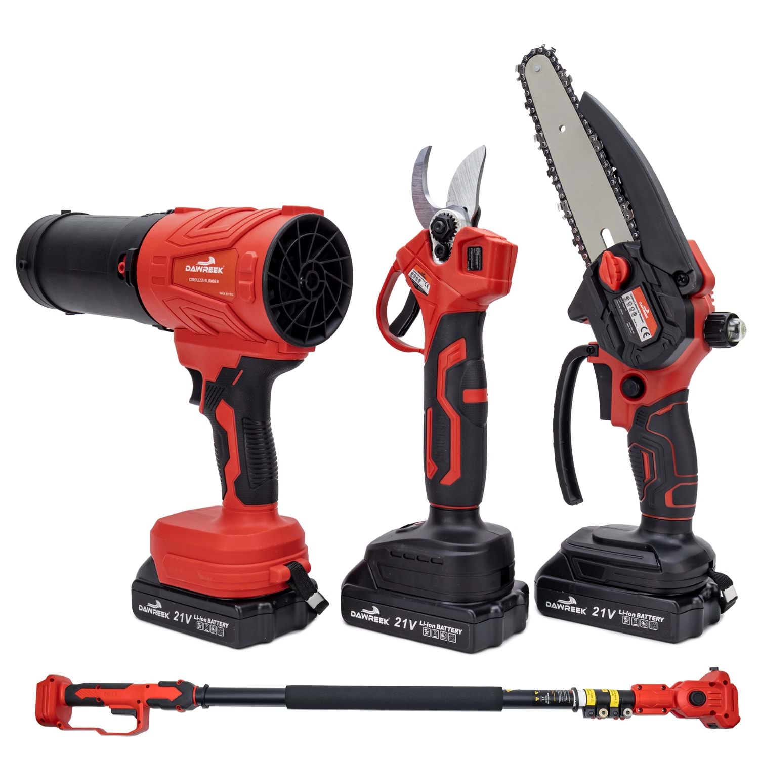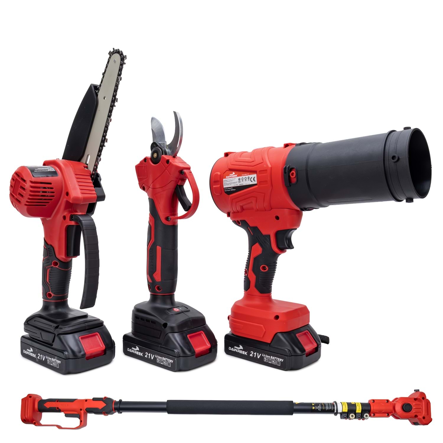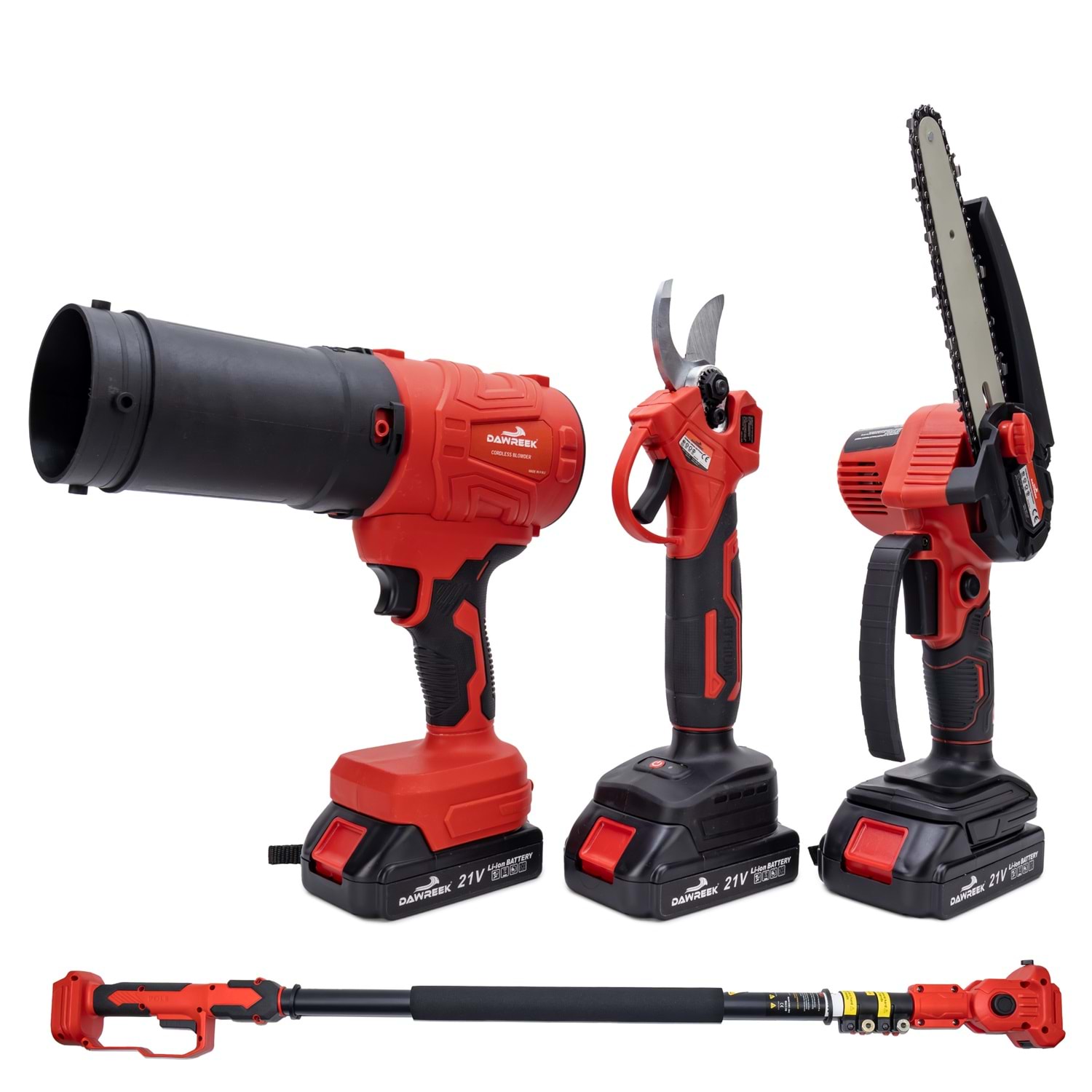 Dawreek BT0241 Dörtlü Budama Seti MW (Teleskopik 2.5m+Ağaç Budama+Bağ Makası+Turbo Fani) Bahçe ve ağaç bakımında tek bir ürünle tüm ihtiyaçlarınızı karşılayın! Dawreek BT0241 dörtlü budama seti, güçlü motor yapısı, çok yönlü kullanım seçenekleri ve 2.5 metre teleskopik uzatma aparatı ile hem amatör hem profesyonel kullanıcılar için ideal bir çözümdür. Ürün İçeriği: Şarjlı mini zincirli testere Şarjlı budama makası Turbo fan (üfleme aparatı) 2.5 metre teleskopik uzatma kolu 2 adet yüksek kapasiteli batarya Şarj cihazı Yedek zincir ve bakım ekipmanları Montaj aparatları ve el aletleri Öne Çıkan Özellikler: 2.5 Metre Uzatma Aparatı: Yüksek dallara merdivensiz, güvenli erişim sağlar. 4 Fonksiyon Tek Set: Kesme, budama ve temizleme işlemlerini tek cihazla yapabilirsiniz. Güçlü Motor Performansı: Sert dallarda bile hızlı ve etkili kesim. Şarjlı ve Taşınabilir: Kablo derdi olmadan özgür kullanım. Ergonomik Tasarım: Uzun süreli kullanımlarda bile konfor sağlar. Çift Batarya Avantajı: Kesintisiz çalışma süresi.
