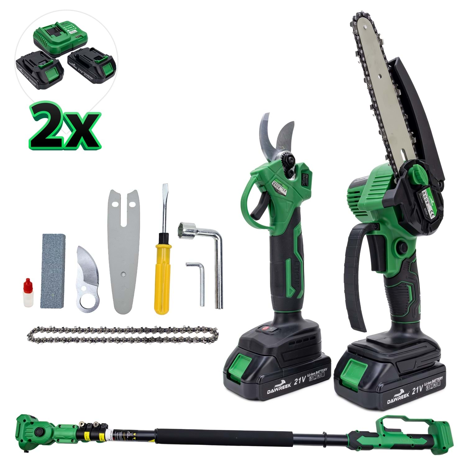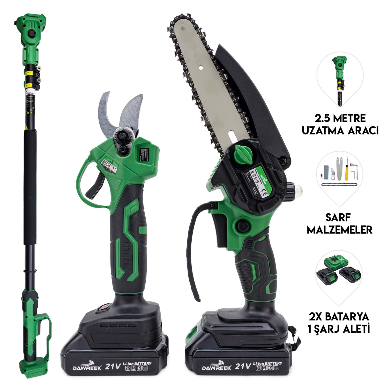 Teleskopik 2.5 m + İkili Budama Seti HT21 BT0237 MK36 teleskopik budama seti, bahçe bakım işlerinizi kolaylaştırmak için tasarlanmış yüksek performanslı bir üründür. Bu set, iki farklı budama aleti içerir: bir teleskopik çit düzeltici ve bir uzatılabilir dal kesme testeresi. İşte bu setin öne çıkan özellikleri: Teleskopik Çit Düzeltici: Ayarlanabilir başlığı sayesinde farklı açılarda kesim yapabilir ve yüksek çitleri rahatlıkla düzeltebilirsiniz. Uzatılabilir Dal Kesme Testeresi: 2.5 metreye kadar uzatılabilen sapı ile yüksek dallara kolayca ulaşabilir ve kesim yapabilirsiniz. 21V/5Ah Bataryalar: Her iki alet de yüksek kapasiteli 21V/5Ah bataryalar ile çalışır, böylece uzun süreli kullanım sağlar. Ergonomik Tasarım: Hafif ve ergonomik yapıları sayesinde kullanıcıya rahatlık sunar ve uzun süreli kullanımlarda bile konfor sağlar. Güvenli Kullanım: Güvenlik özellikleri ile donatılmış olup, kullanıcıyı olası kazalardan korur. Kolay Bakım: Kolay bakım özellikleri sayesinde cihazların ömrünü uzatabilir ve performanslarını koruyabilirsiniz. MK36 teleskopik budama seti, hem profesyonel hem de ev kullanımı için ideal bir çözümdür. Bahçe bakım işlerinizi kolaylaştırmak ve daha verimli hale getirmek için mükemmel bir yardımcıdır.