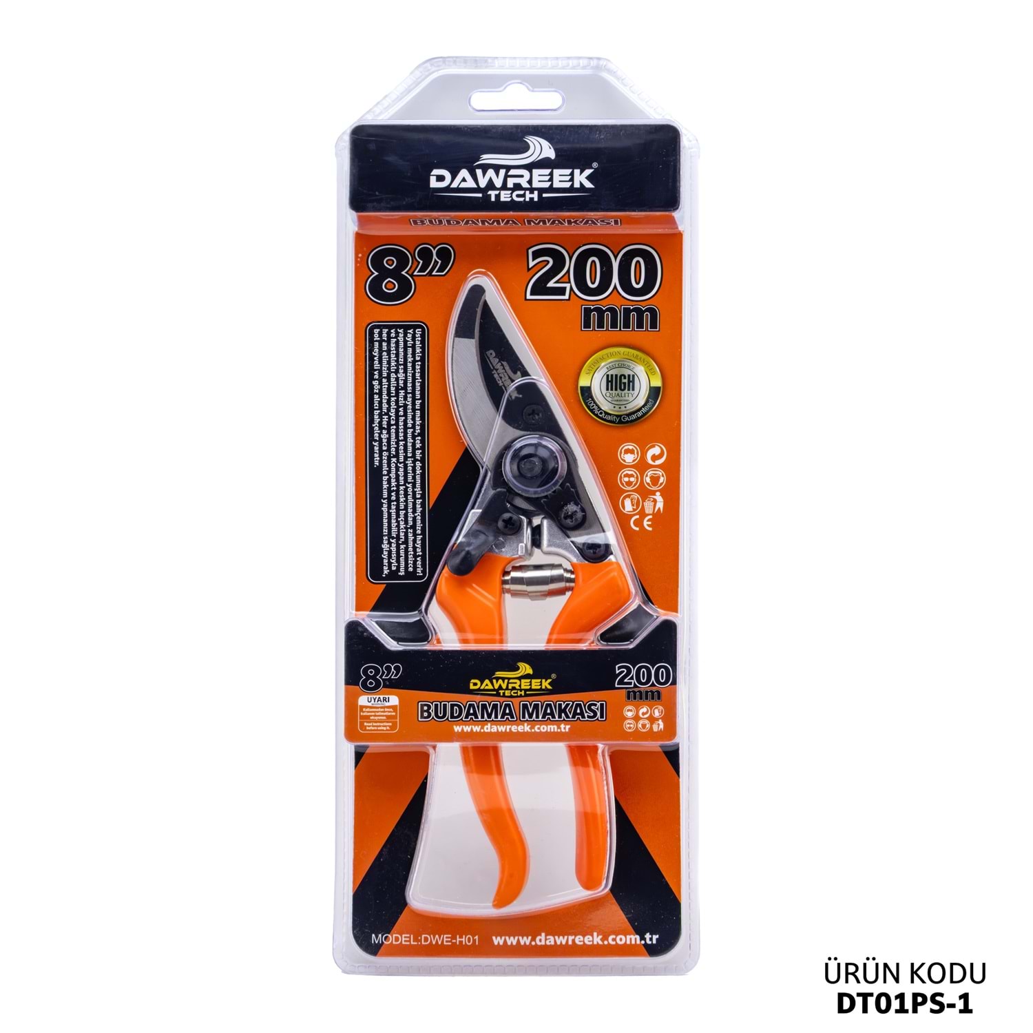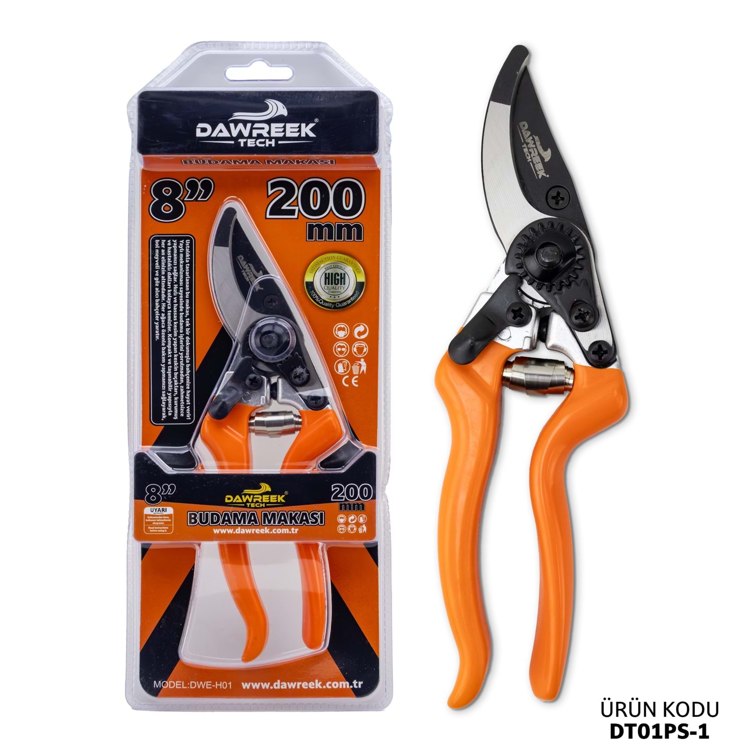 DAWREEK TECH 8” (200 mm) Budama Makası – DT01PS-1 Bahçe bakımında profesyonel sonuçlar elde etmek isteyenler için tasarlanan Dawreek Tech budama makası, güçlü yapısı ve ergonomik tasarımıyla işlerinizi kolaylaştırır. Hem amatör kullanıcılar hem de profesyoneller için ideal bir yardımcıdır. Ürün Özellikleri: Boyut: 8 inç (200 mm) Keskin ve Dayanıklı Bıçak: Yüksek kaliteli çelikten üretilmiş, uzun süre keskinliğini korur Güçlü Yay Mekanizması: Daha az eforla daha fazla kesim imkanı Ergonomik Sap Tasarımı: Uzun süreli kullanımlarda bile el yorgunluğunu azaltır Kilitleme Mekanizması: Güvenli kullanım ve kolay saklama sağlar Dayanıklı Gövde: Yoğun kullanıma uygun sağlam yapı