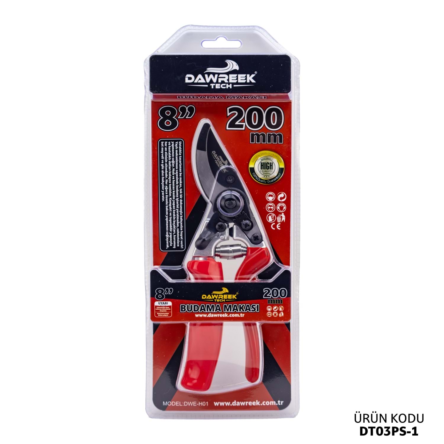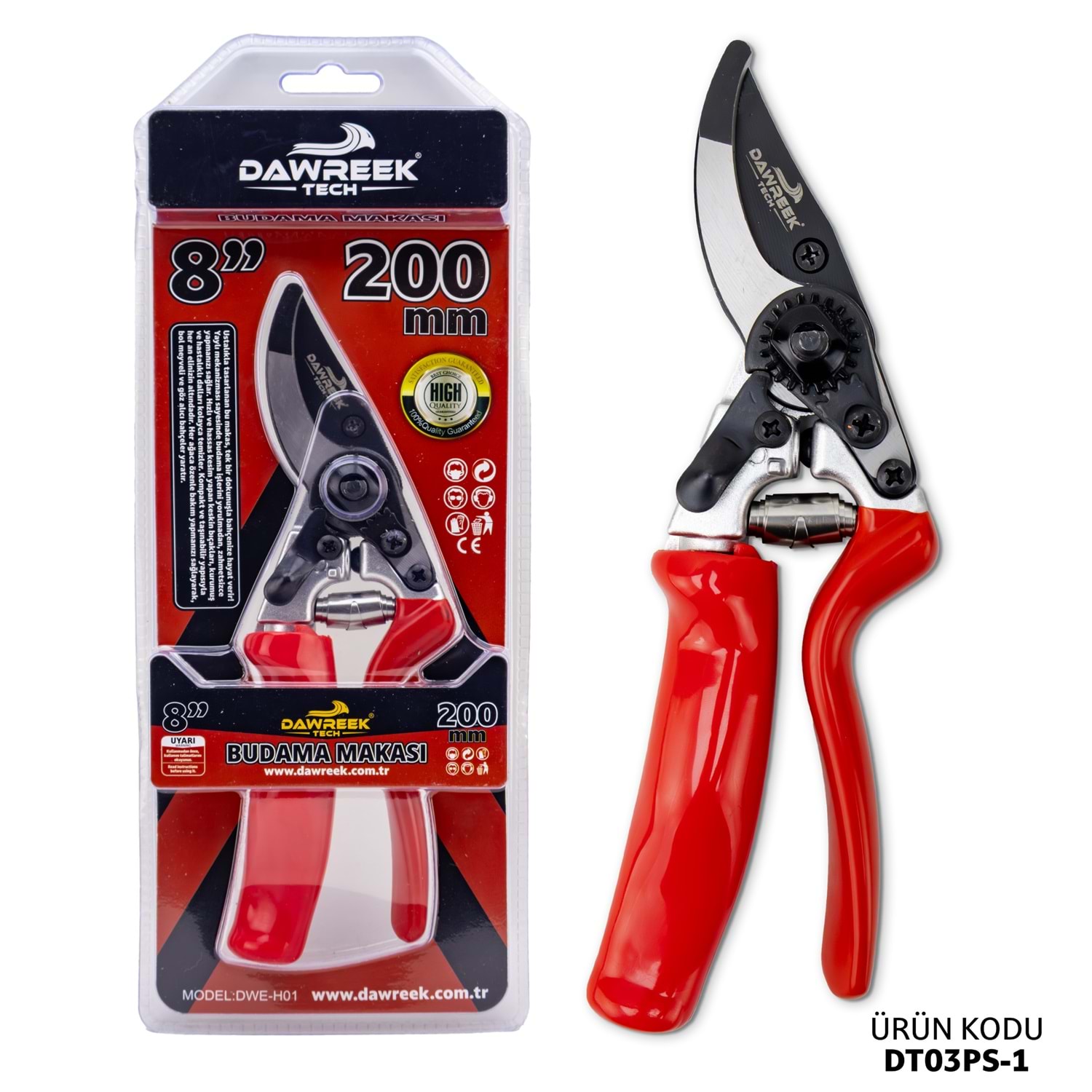 DAWREEK TECH 8” (200 mm) Budama Makası – DT03PS-1 Bahçe bakımında profesyonel sonuçlar elde etmek isteyenler için tasarlanan Dawreek Tech budama makası, güçlü yapısı ve ergonomik tasarımıyla işlerinizi kolaylaştırır. Hem amatör kullanıcılar hem de profesyoneller için ideal bir yardımcıdır. Ürün Özellikleri: Boyut: 8 inç (200 mm) Keskin ve Dayanıklı Bıçak: Yüksek kaliteli çelikten üretilmiş, uzun süre keskinliğini korur Güçlü Yay Mekanizması: Daha az eforla daha fazla kesim imkanı Ergonomik Sap Tasarımı: Uzun süreli kullanımlarda bile el yorgunluğunu azaltır Kilitleme Mekanizması: Güvenli kullanım ve kolay saklama sağlar Dayanıklı Gövde: Yoğun kullanıma uygun sağlam yapı