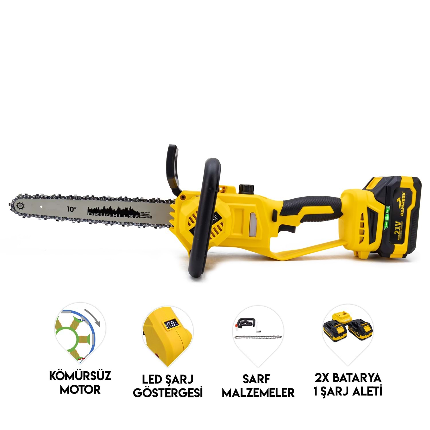 ŞARJLI AĞAÇ KESME DW10 BT0244 MK10, yüksek performanslı ve taşınabilir bir şarjlı ağaç kesme cihazıdır. Bu cihaz, çeşitli ağaç kesme ve budama işlemlerinde kullanılmak üzere tasarlanmıştır. DW10’nin öne çıkan özellikleri: Kömürsüz Motor: Kömürsüz motor teknolojisi, daha uzun ömür ve daha az bakım gerektirir, aynı zamanda daha verimli bir performans sunar. Yedek Bilezik: Cihaz, yedek bilezik ile birlikte gelir, böylece kesme işlemlerinizde kesintisiz çalışabilirsiniz. Çift Bakım: Çift bakım özelliği sayesinde cihazın bakımını kolayca yapabilir ve uzun ömürlü kullanım sağlayabilirsiniz. Ergonomik Tasarım: Hafif ve ergonomik yapısı sayesinde kullanıcıya rahatlık sunar ve uzun süreli kullanımlarda bile konfor sağlar. Güçlü Batarya: Yüksek kapasiteli bataryası ile uzun süreli kesme işlemlerinde bile kesintisiz performans sunar. Güvenli Kullanım: Güvenlik özellikleri ile donatılmış olup, kullanıcıyı olası kazalardan korur. DW10 şarjlı ağaç kesme cihazı, hem profesyonel hem de ev kullanımı için ideal bir çözümdür. Ağaç kesme ve budama işlerinizi kolaylaştırmak için mükemmel bir yardımcıdır.