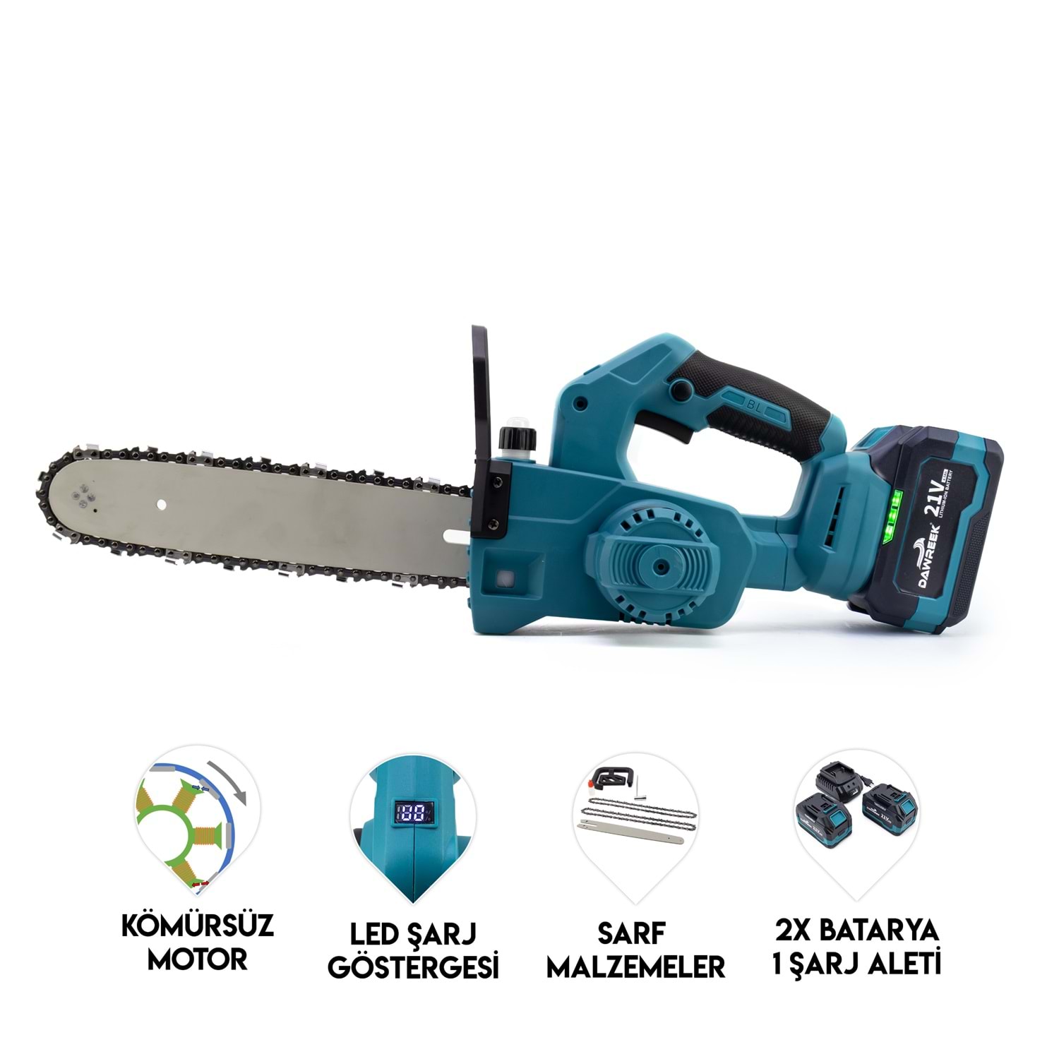 MK12 Şarjlı Ağaç Kesme BT0119 MK12, yüksek performanslı ve taşınabilir bir şarjlı ağaç kesme cihazıdır. Bu cihaz, çeşitli ağaç kesme ve budama işlemlerinde kullanılmak üzere tasarlanmıştır. MK12’nin öne çıkan özellikleri: Kömürsüz Motor: Kömürsüz motor teknolojisi, daha uzun ömür ve daha az bakım gerektirir, aynı zamanda daha verimli bir performans sunar. Yedek Bilezik: Cihaz, yedek bilezik ile birlikte gelir, böylece kesme işlemlerinizde kesintisiz çalışabilirsiniz. Çift Bakım: Çift bakım özelliği sayesinde cihazın bakımını kolayca yapabilir ve uzun ömürlü kullanım sağlayabilirsiniz. Ergonomik Tasarım: Hafif ve ergonomik yapısı sayesinde kullanıcıya rahatlık sunar ve uzun süreli kullanımlarda bile konfor sağlar. Güçlü Batarya: Yüksek kapasiteli bataryası ile uzun süreli kesme işlemlerinde bile kesintisiz performans sunar. Güvenli Kullanım: Güvenlik özellikleri ile donatılmış olup, kullanıcıyı olası kazalardan korur. MK12 şarjlı ağaç kesme cihazı, hem profesyonel hem de ev kullanımı için ideal bir çözümdür. Ağaç kesme ve budama işlerinizi kolaylaştırmak için mükemmel bir yardımcıdır.