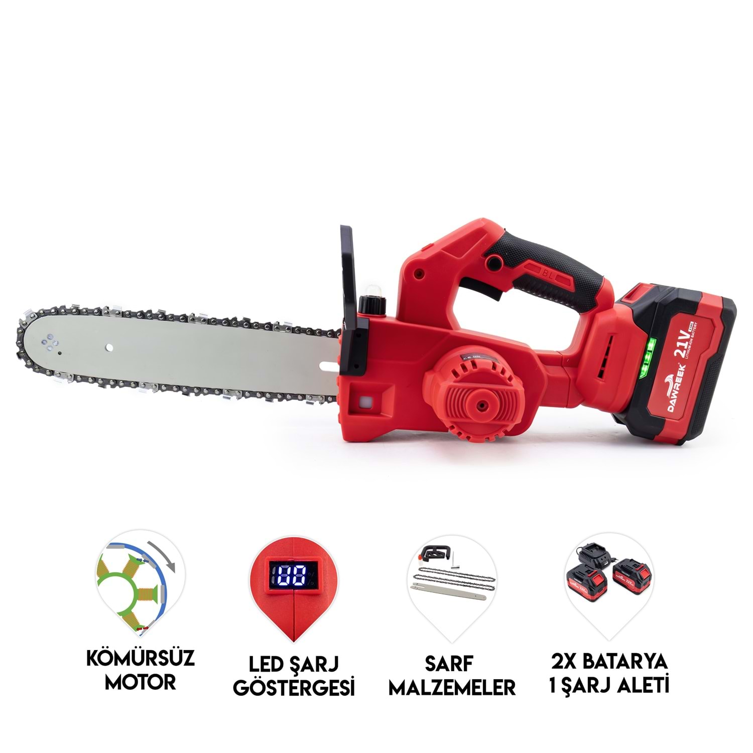 MK12 Şarjlı Ağaç Kesme BT0119 MW12, yüksek performanslı ve taşınabilir bir şarjlı ağaç kesme cihazıdır. Bu cihaz, çeşitli ağaç kesme ve budama işlemlerinde kullanılmak üzere tasarlanmıştır. MW12’nin öne çıkan özellikleri: Kömürsüz Motor: Kömürsüz motor teknolojisi, daha uzun ömür ve daha az bakım gerektirir, aynı zamanda daha verimli bir performans sunar. Yedek Bilezik: Cihaz, yedek bilezik ile birlikte gelir, böylece kesme işlemlerinizde kesintisiz çalışabilirsiniz. Çift Bakım: Çift bakım özelliği sayesinde cihazın bakımını kolayca yapabilir ve uzun ömürlü kullanım sağlayabilirsiniz. Ergonomik Tasarım: Hafif ve ergonomik yapısı sayesinde kullanıcıya rahatlık sunar ve uzun süreli kullanımlarda bile konfor sağlar. Güçlü Batarya: Yüksek kapasiteli bataryası ile uzun süreli kesme işlemlerinde bile kesintisiz performans sunar. Güvenli Kullanım: Güvenlik özellikleri ile donatılmış olup, kullanıcıyı olası kazalardan korur. MW12 şarjlı ağaç kesme cihazı, hem profesyonel hem de ev kullanımı için ideal bir çözümdür. Ağaç kesme ve budama işlerinizi kolaylaştırmak için mükemmel bir yardımcıdır.