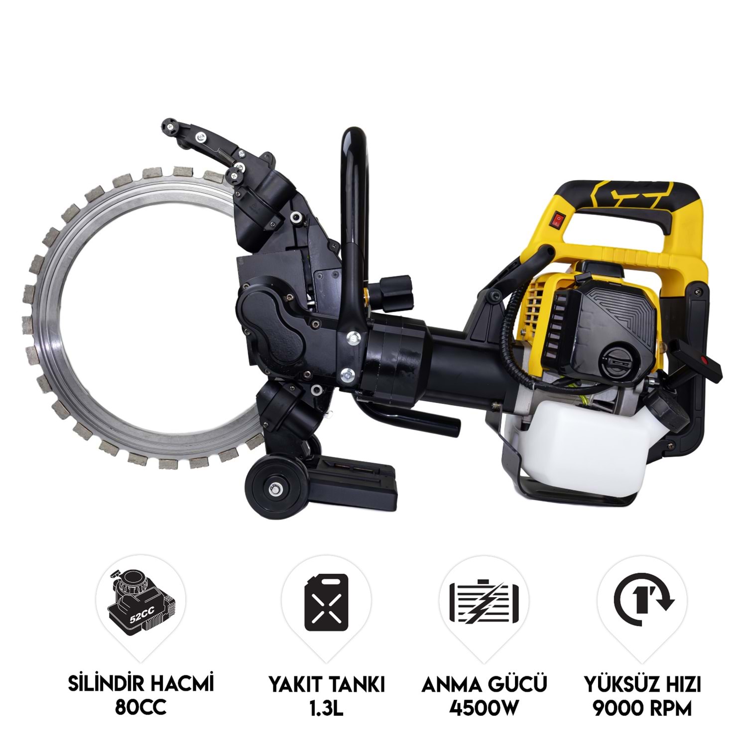 Benzinli Duvar Kesme Makinesi 80cc GS0018 4500W Güç | 9000 RPM | Profesyonel Seri | Yakıtlı Sistem Ürün Özellikleri Motor Tipi: Benzinli Silindir Hacmi: 80 cc Anma Gücü: 4500 W Yüksüz Hız: 9000 RPM Yakıt Tankı Kapasitesi: 1.3 L Kullanım Tipi: Profesyonel Ürün Açıklaması Benzinli duvar kesme makinesi, yüksek performans gerektiren zorlu kesim işleri için tasarlanmıştır. Elektriğe ihtiyaç duymadan çalışabilen güçlü motoru sayesinde sahada maksimum hareket özgürlüğü sunar. 80 cc motor hacmi ve 4500W gücü ile beton, asfalt ve sert yüzeylerde hızlı ve etkili kesim sağlar. Öne Çıkan Avantajlar Elektrik gerektirmez – her yerde kullanım 9000 RPM yüksek hız ile hızlı kesim Güçlü 80cc motor ile üstün performans 1.3L yakıt tankı ile uzun süre çalışma Zorlu şantiye koşullarına uygun