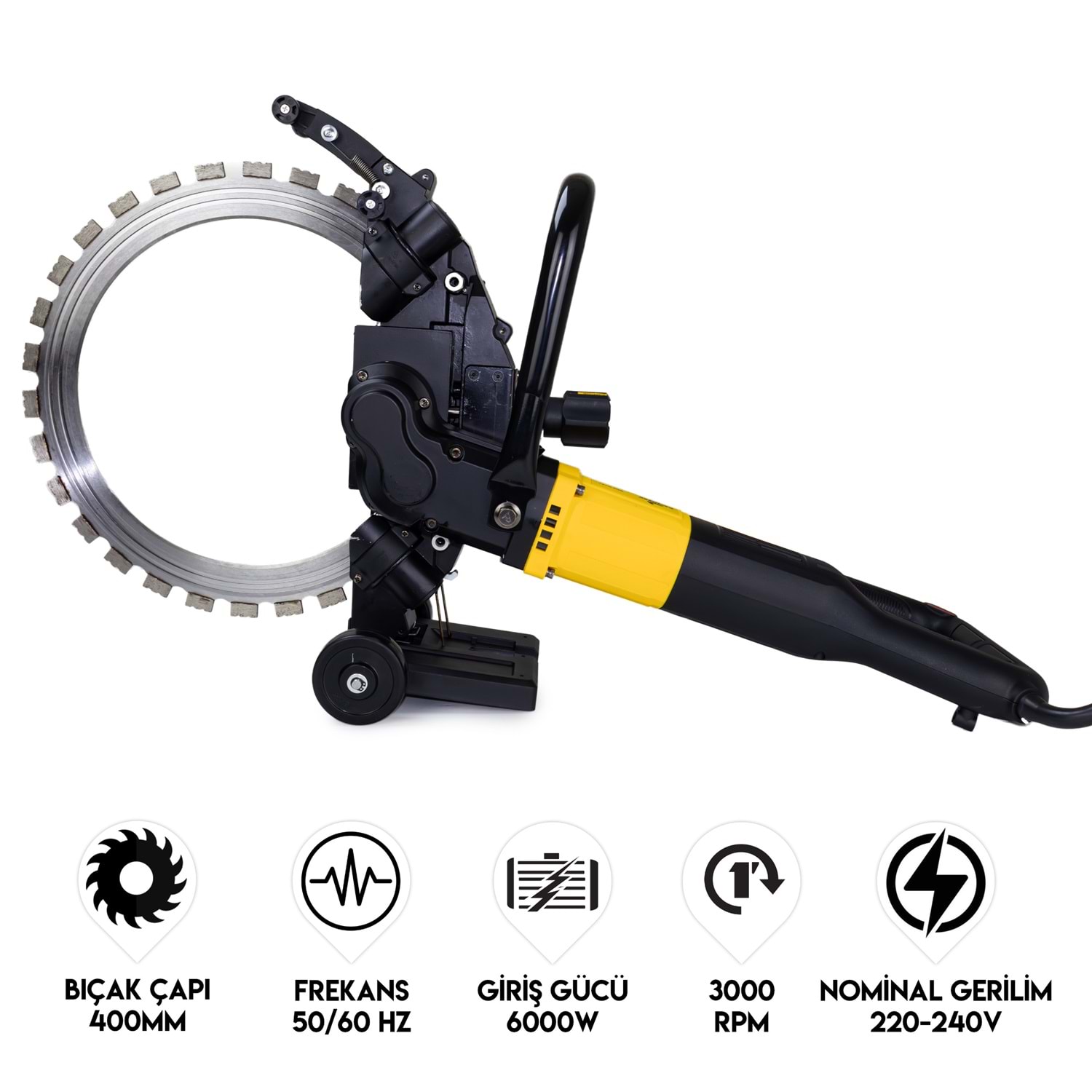 Duvar Kesme (Halka Testere) EL0050 6000W Güç | 400mm Bıçak | 3000 RPM | Profesyonel Seri Ürün Özellikleri Motor Gücü: 6000W Bıçak Çapı: 400 mm Devir Hızı: 3000 RPM Çalışma Voltajı: 220-240V Frekans: 50/60 Hz Kullanım Tipi: Elektrikli Ürün Açıklaması EL0050 Duvar Kesme (Halka Testere), yüksek performans gerektiren profesyonel işler için tasarlanmıştır. Güçlü 6000W motoru sayesinde beton, tuğla ve sert yüzeylerde hızlı ve temiz kesim imkanı sunar. 400 mm geniş bıçak çapı ile derin ve geniş kesimlerde üstün verim sağlar. Öne Çıkan Avantajlar Yüksek güç ile hızlı kesim Geniş çaplı bıçak ile derin kesim imkanı Dayanıklı ve uzun ömürlü yapı Profesyonel kullanıma uygun tasarım Şantiye ve tadilat işleriniz için ideal Kullanım Alanları Beton ve duvar kesme Kapı / pencere boşluğu açma İnşaat ve tadilat işleri Profesyonel şantiye uygulamaları