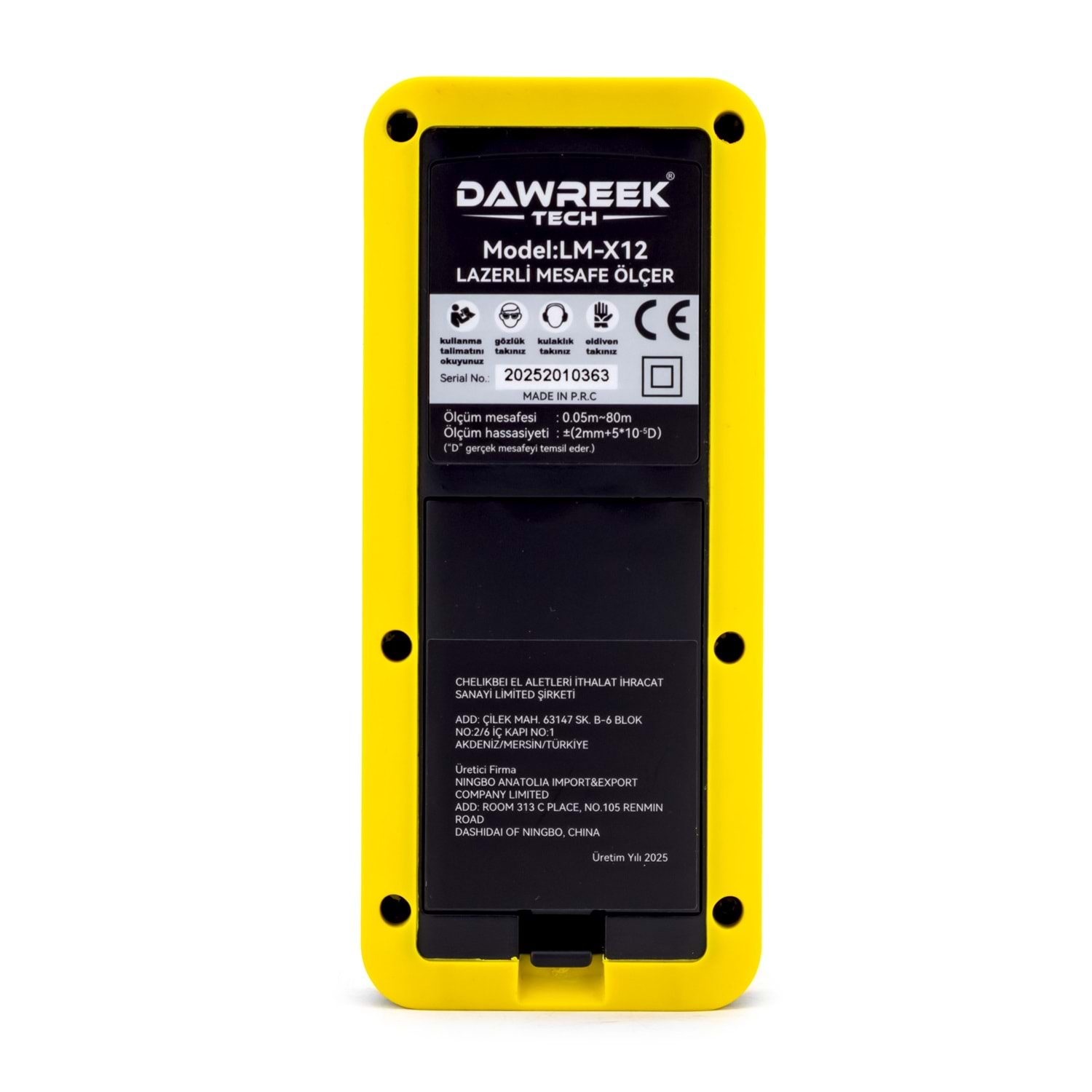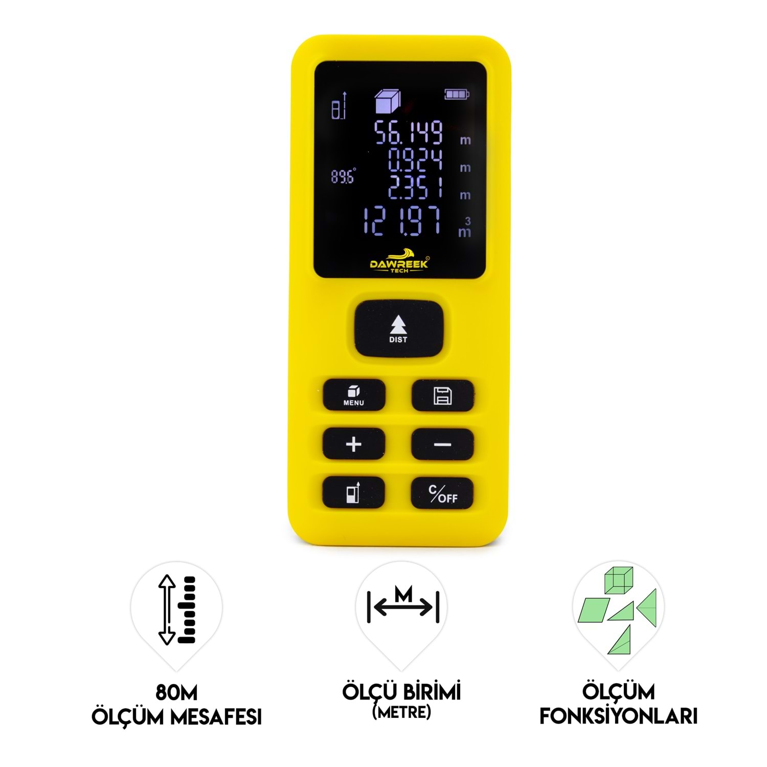 DAWREEK TECH MESAFE ÖLÇER E40 YELLOW 80 Metre Dijital El Tipi Mesafe Ölçüm Cihazı PL005 MESAFE ÖLÇER E40YELLOW, iç ve dış mekânlarda hızlı, hassas ve güvenilir mesafe ölçümü yapmak isteyenler için geliştirilmiş dijital el tipi ölçüm cihazıdır. 0.05 m – 80 m ölçüm kapasitesi sayesinde inşaat, tadilat, emlak, dekorasyon ve ev içi ölçümler için idealdir. 2. sınıf lazer teknolojisi ile donatılan bu lazer metre, ölçümleri yalnızca 0.25 saniyede gerçekleştirerek zamandan tasarruf sağlar. Otomatik kapanma özelliği, pil ömrünü uzatırken, ergonomik ve kompakt tasarımı sayesinde tek elle rahat kullanım sunar. 3 adet AAA alkalin pil ile çalışan MESAFE ÖLÇER E40 YELLOW, 0°C ile +40°C arasındaki sıcaklıklarda sorunsuz şekilde çalışır. Taşınabilir yapısı ve kullanıcı dostu tasarımıyla hem profesyoneller hem de bireysel kullanıcılar için ideal bir çözümdür. Öne Çıkan Özellikler •80 metreye kadar lazerli mesafe ölçümü •Dijital, hızlı ve hassas ölçüm •El tipi, kompakt ve hafif tasarım •Enerji tasarruflu otomatik kapanma •İnşaat, emlak ve ev kullanımı için uygun Teknik Bilgiler •Lazer Sınıfı: 2. Sınıf •Ölçüm Aralığı: 0.05 m – 80 m •Ölçüm Süresi: 0.25 sn •Pil: 3 × 1.5V AAA Alkalin •Lazer Kapanma: 30 sn •Cihaz Kapanma: 180 sn •Çalışma Sıcaklığı: 0°C ~ +40°C