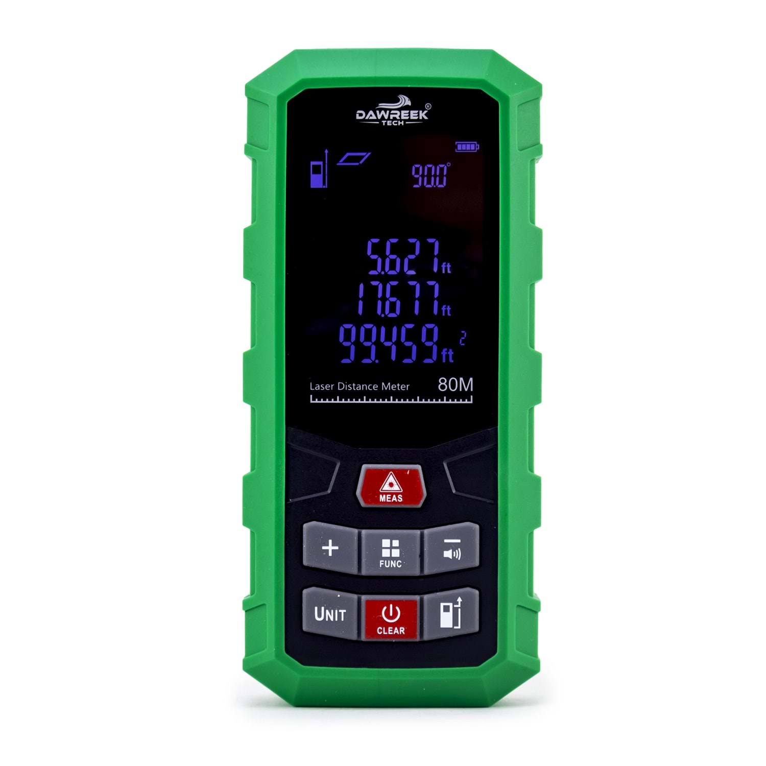 DAWREEK TECH MESAFE ÖLÇER H01 GREEN 80 Metre Dijital El Tipi Mesafe Ölçüm Cihazı PL003 MESAFE ÖLÇER H01 GREEN , iç ve dış mekânlarda hızlı, hassas ve güvenilir mesafe ölçümü yapmak isteyenler için geliştirilmiş dijital el tipi ölçüm cihazıdır. 0.05 m – 80 m ölçüm kapasitesi sayesinde inşaat, tadilat, emlak, dekorasyon ve ev içi ölçümler için idealdir. 2. sınıf lazer teknolojisi ile donatılan bu lazer metre, ölçümleri yalnızca 0.25 saniyede gerçekleştirerek zamandan tasarruf sağlar. Otomatik kapanma özelliği, pil ömrünü uzatırken, ergonomik ve kompakt tasarımı sayesinde tek elle rahat kullanım sunar. 3 adet AAA alkalin pil ile çalışan MESAFE ÖLÇER H01 GREEN, 0°C ile +40°C arasındaki sıcaklıklarda sorunsuz şekilde çalışır. Taşınabilir yapısı ve kullanıcı dostu tasarımıyla hem profesyoneller hem de bireysel kullanıcılar için ideal bir çözümdür. Öne Çıkan Özellikler •80 metreye kadar lazerli mesafe ölçümü •Dijital, hızlı ve hassas ölçüm •El tipi, kompakt ve hafif tasarım •Enerji tasarruflu otomatik kapanma •İnşaat, emlak ve ev kullanımı için uygun Teknik Bilgiler •Lazer Sınıfı: 2. Sınıf •Ölçüm Aralığı: 0.05 m – 80 m •Ölçüm Süresi: 0.25 sn •Pil: 3 × 1.5V AAA Alkalin •Lazer Kapanma: 30 sn •Cihaz Kapanma: 180 sn •Çalışma Sıcaklığı: 0°C ~ +40°C