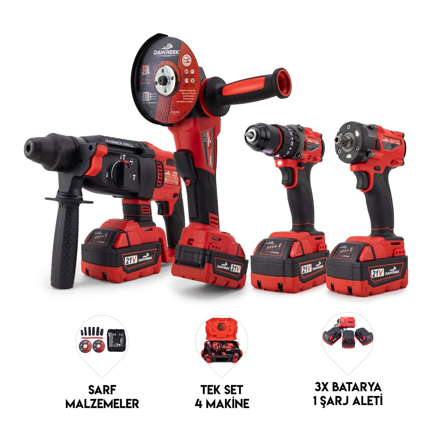 DÖRTLÜ SET MW350R – BT0205 Dawreek MW350R Dörtlü Set, profesyonel ve yoğun kullanımlar için tasarlanmış güçlü ve dayanıklı bir settir. Kömürsüz motor teknolojisi sayesinde daha uzun ömürlü, daha verimli ve yüksek performanslı çalışma sunar. Set İçeriği: 10 mm çelik mandrenli matkap 350 Nm güçlü somun sıkma makinesi 125 mm spiral (taşlama) makinesi Şarjlı hilti 3 adet yüksek kapasiteli batarya 1 adet hızlı şarj aleti Sarf malzemeleri Öne Çıkan Özellikler: Kömürsüz motor teknolojisi 350 Nm yüksek tork gücü (somun sıkma) 125 mm güçlü spiral taşlama 10 mm sağlam çelik mandren Uzun çalışma süresi sağlayan 3 batarya Profesyonel ve endüstriyel kullanıma uygun tasarım