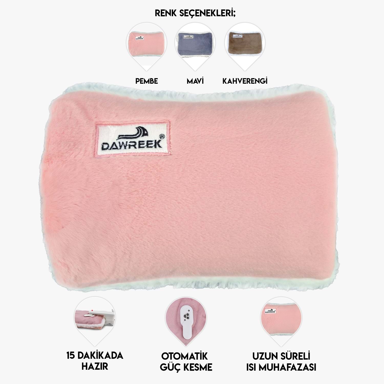 ELEKTRİKLİ SICAK SU TORBASI PİNK ET02P Dawreek elektrikli sıcak su torbası, soğuk havalarda ve ağrılı bölgelerde hızlı ve güvenli ısınma sağlar. Yaklaşık 15 dakikada hazır hale gelir, otomatik güç kesme özelliği sayesinde güvenle kullanılır. Yumuşak peluş kılıfı ile cilde temas ettiğinde konfor sunar ve uzun süre ısı muhafazası yapar. Günlük kullanım için pratik ve şık bir çözümdür. Öne Çıkan Özellikler: •15 dakikada hızlı ısınma •Otomatik güç kesme (güvenli kullanım) •Uzun süreli ısı koruması •Yumuşak peluş kılıf •Boyun, bel, karın ve sırt için ideal •Pembe, mavi ve kahverengi renk seçenekleri
